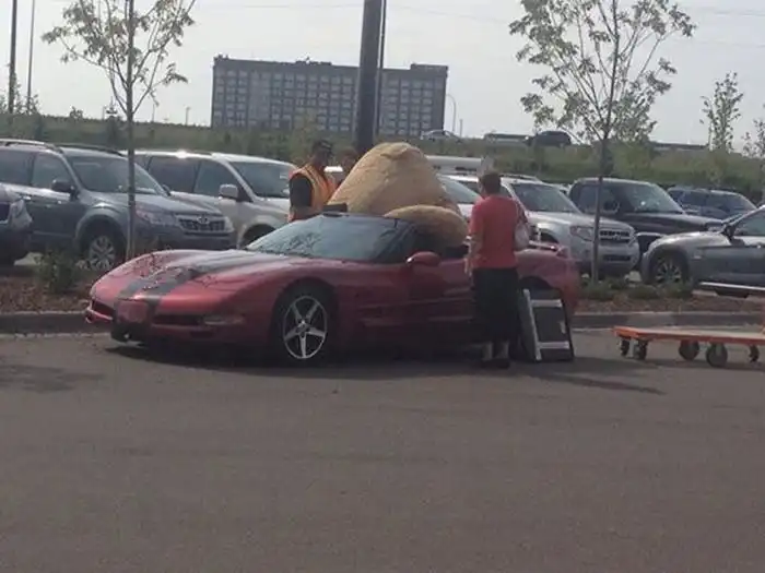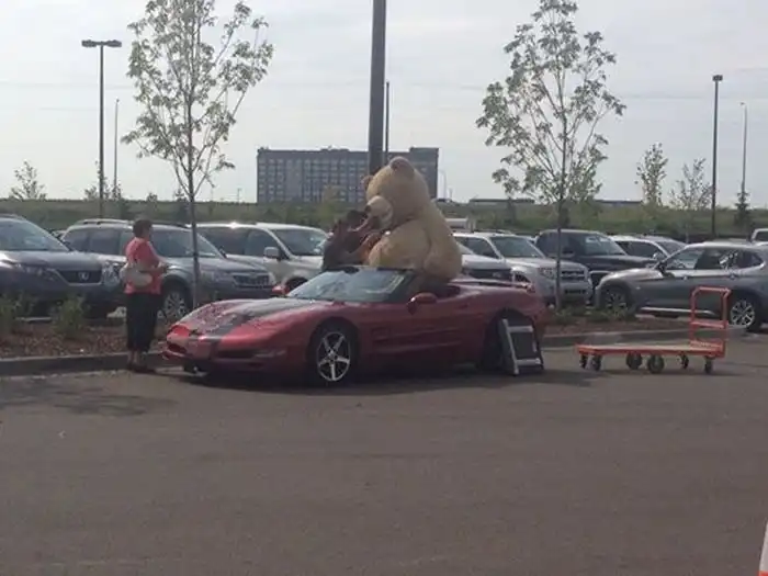 Владелец этого спортивного Chevrolett Corvette решил удивить свою возлюбленную и приобрел в магазине вот такой необычный подарок ;) Но сразу же после приобретения, парень столкнулся с одной "маленькой" проблемкой: "каким образом доставить этот подарок, ведь он действительно немаленьких размеров".. Со стороны, конечно, это всё смотрелось более, чем просто забавно ))