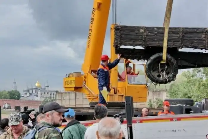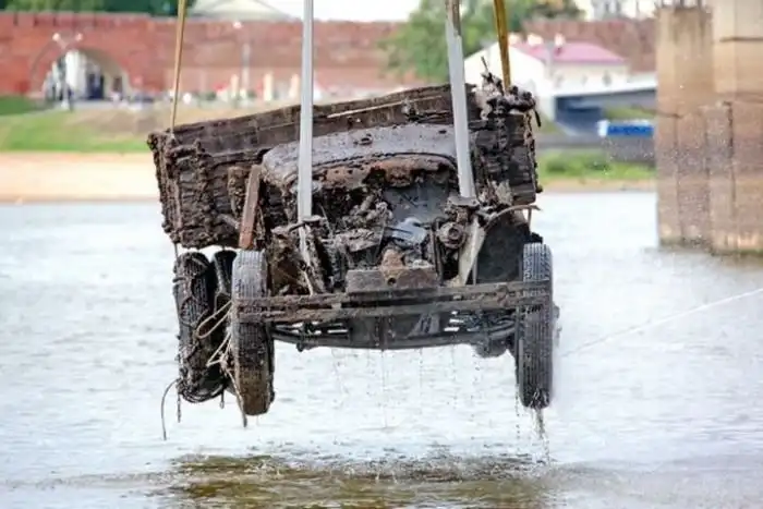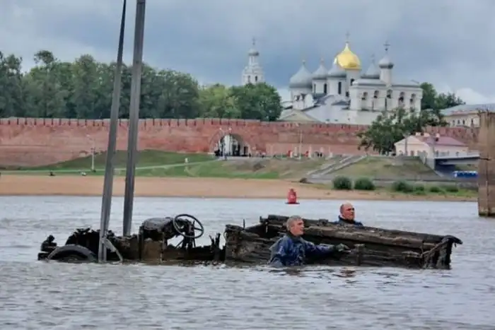 На днях на дне реки Мста, которая протекает в Тверской и Новгородской областях России, был обнажен автомобиль АМО-2 времен Великой Отечественной войны. Работы по подъему с 4-метровой глубины длились почти 3 дня и, наконец, успешно были завершены. Теперь этот военный автомобиль будет доставлен в Новгородский Кремль, где уже определено место для его реставрации.