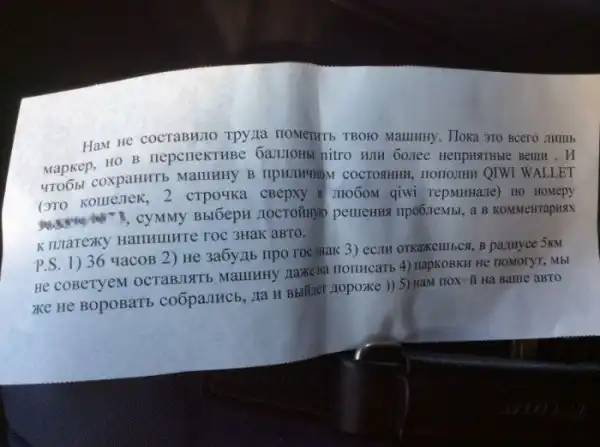 Автор этих снимков был весьма удивлен, когда утром на стекле своего автомобиля обнаружил странный символ, нарисованный маркером, и записку, оставленную под щеткой дворника. Честно говоря, автомобильные разводилы уже совсем страх потеряли, ведь это - уже настоящий разбой с угрозами. А что бы вы сделали, если бы попали в подобную ситуацию?