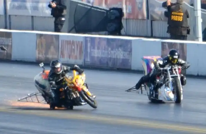 Дрэг-рейсинг на мотоциклах - это один из самых опасных и самых скоростных видов спорта во всем мире, во время которого случается немало трагический аварий на предельных скоростях. Сегодня я предлагаю вам посмотреть на то, как один из гонщиков потерял управление над мотоциклом на скорости более 300 км/ч, но в момент падения он сумел каким-то чудом сориентироваться и ухватиться за байк своего оппонента. Молниеносная реакция и везение - это именно те два основных фактора, которые спасли ему жизнь.