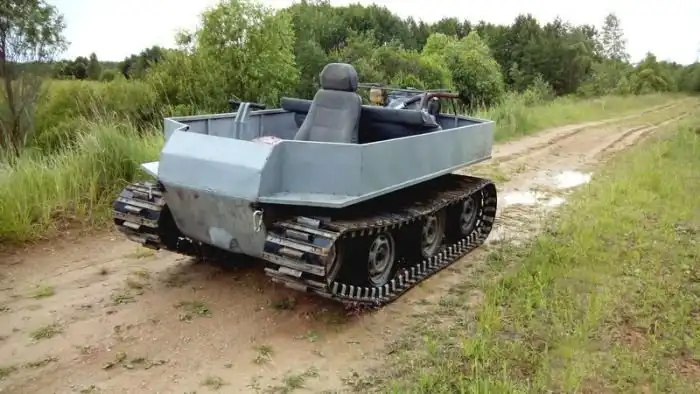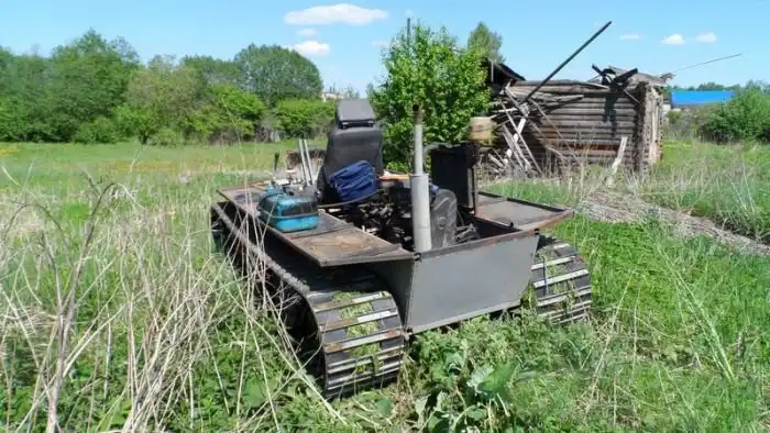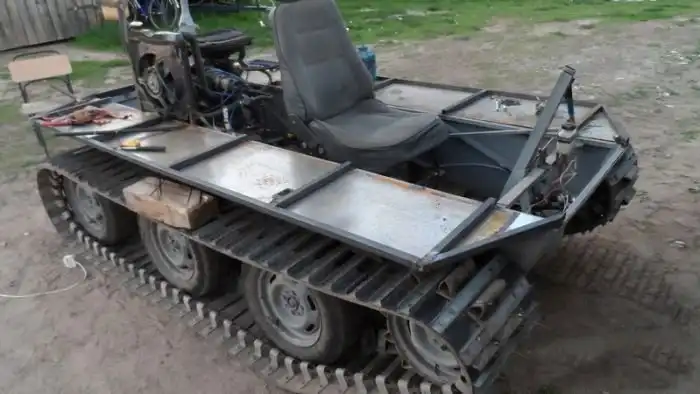 Один парень из глубинки решил сделать из подручных средств в гараже своего загородного дома настоящий вездеход на гусеничном ходу. Для его сборки был использован двигатель и КПП от Ваз 2108, а задний мост от классики. Что самое интересное, в итоге получился отличный самодельный вездеход, которого точно бездорожьем не испугаешь.