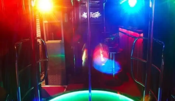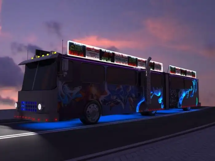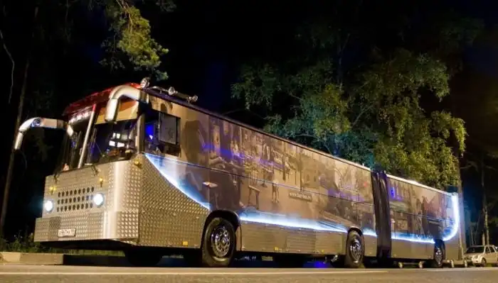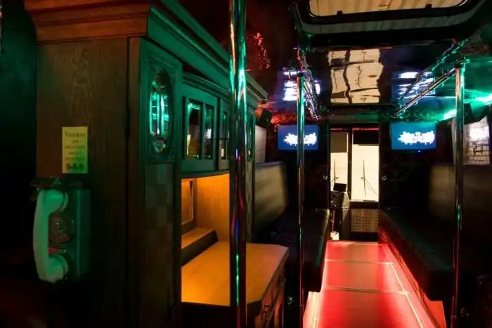 От автобуса оставили только раму, в то время как все остальное было подобрано специально для данного проекта. Новые панели кузова, полированные диски и оригинальная отделка экстерьера, все это отходит на второй план, когда оказываешься внутри передвижного бара. Здесь пассажиров встречают мягкие кожаные диваны, барная стойка с высокими стульями, небольшой танцпол с шестом, выполняющим еще и роль поручня, экраны на стенах, мощная аудиосистема со светомузыкой и полноценный диджейский пульт.
