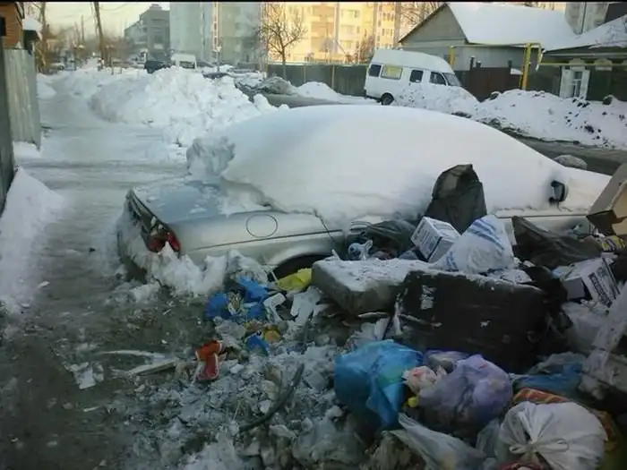 В частном секторе города Омск посреди мусора был обнаружен автомобиль марки Jaguar. Возле покрытой снегом иномарки выросла куча мусора, который сюда набросали местные жители. На этом месте машина стоит с лета прошлого года, так как требует серьезного ремонта.