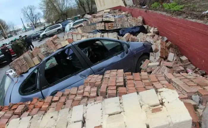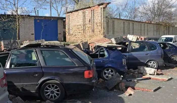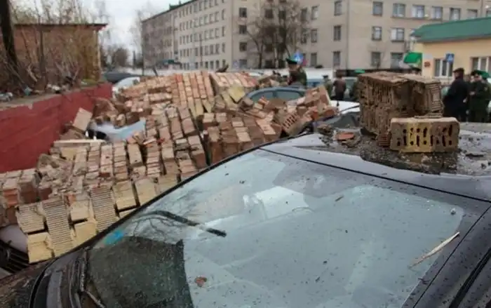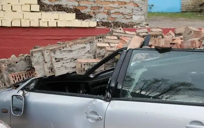 Штормовой ветер, налетевший недавно на Брест, стал причиной обрушения кирпичной стены гаражного кооператива по улице обороны Брестской крепости. Кирпичи обрушились прямо на припаркованные у стены автомобили, получившие серьезные механические повреждения. Всего пострадало 10 машин. Кроме того в других районах города поваленные деревья упали еще на четыре авто.