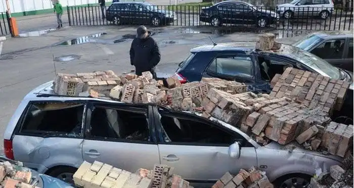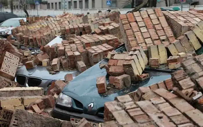 В Бресте штормовой ветер обрушил кирпичную стену на припаркованные автомобили
