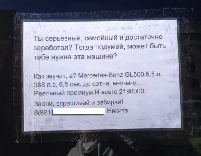 Правильная реклама – это прямой путь к успеху в любом деле. Понимая это, один житель северной столицы составил креативное объявление по продаже своего автомобиля Mercedes-Benz GL500. Несколько листовок были расклеены на стеклах люксового внедорожника, что привлекло к машине не только потенциальных клиентов, но и простых прохожих, которые даже выстроились в небольшую очередь на тротуаре, чтобы прочесть этот шедевр маркетинга.