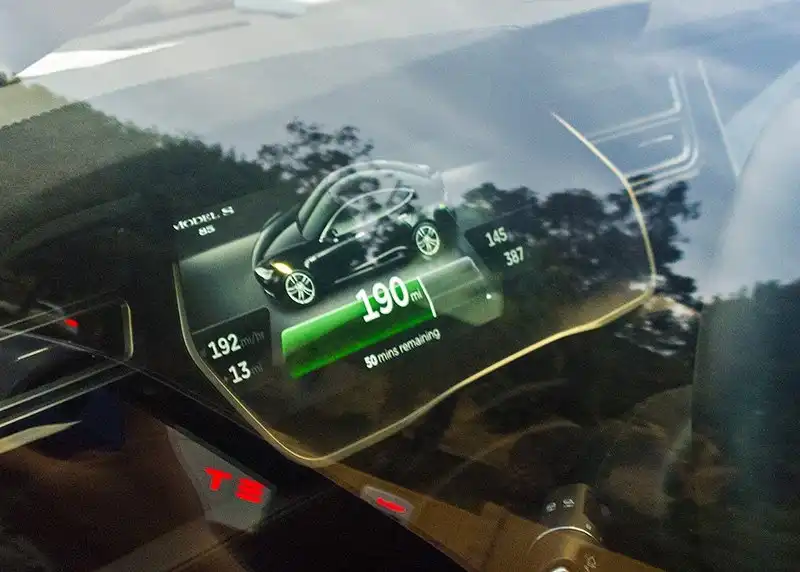 По его словам 100% заряда можно получить менее чем за полтора часа, тогда как его домашнее зарядное устройство позволяет зарядить машину полностью за 8 часов, то есть за ночь. Отметим, что приобрести SUPERCHARGER домой нельзя. Для дома предназначены только стандартные портативные зарядки. Ниже на приборной панели видно, что на текущем заряде машина уже может проехать около 190 миль (300км), а до конца процесса осталось еще 50 минут.