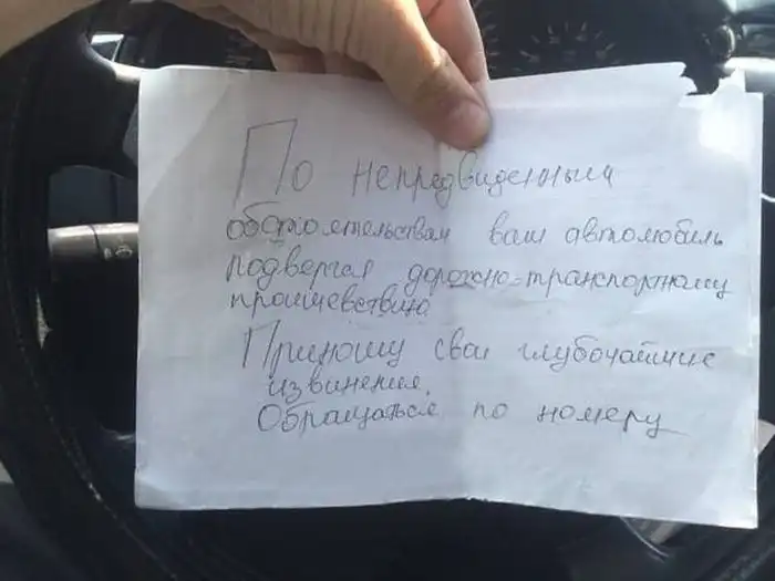 Житель города Павлодар, Казахстан, обнаружил на лобовом стекле своего поврежденного автомобиля Mercedes-Benz E-Class записку, оставленную виновником ДТП. В записке не только были принесены извинения, но и указан контактный номер телефона. Мужчина позвонил по номеру и договорился о встрече. На СТО оценили стоимость ремонта, и виновник ДТП его оплатил. Сам хозяин авто удивлен такой порядочностью, так как авария произошла ночью и свидетелей не было.