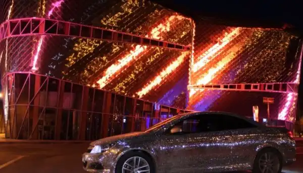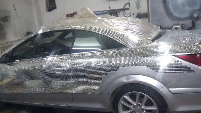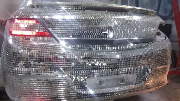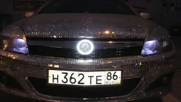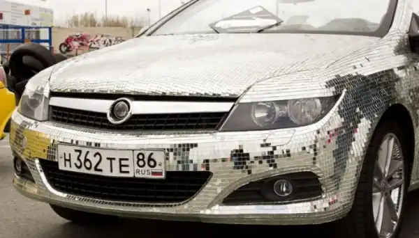 В Ханты-Мансийском автономном округе можно встретить абсолютно уникальный автомобиль, кузов которого обклеен 40 тысячами кусочков зеркал. Работа над эксклюзивным купе-кабриолетом марки Opel началась в 2012 году, после того как владелец решил провести косметический ремонт, однако, цена в 40 – 60 тысяч за покраску кузова повергла его в шок и он собрался решить данный вопрос собственными силами. В течение нескольких лет хозяин собственноручно клеил кусочки стекла на кузов своей машины и, наконец, закончил свой безумный, на первый взгляд, проект. Что у него получилось, смотрите далее.