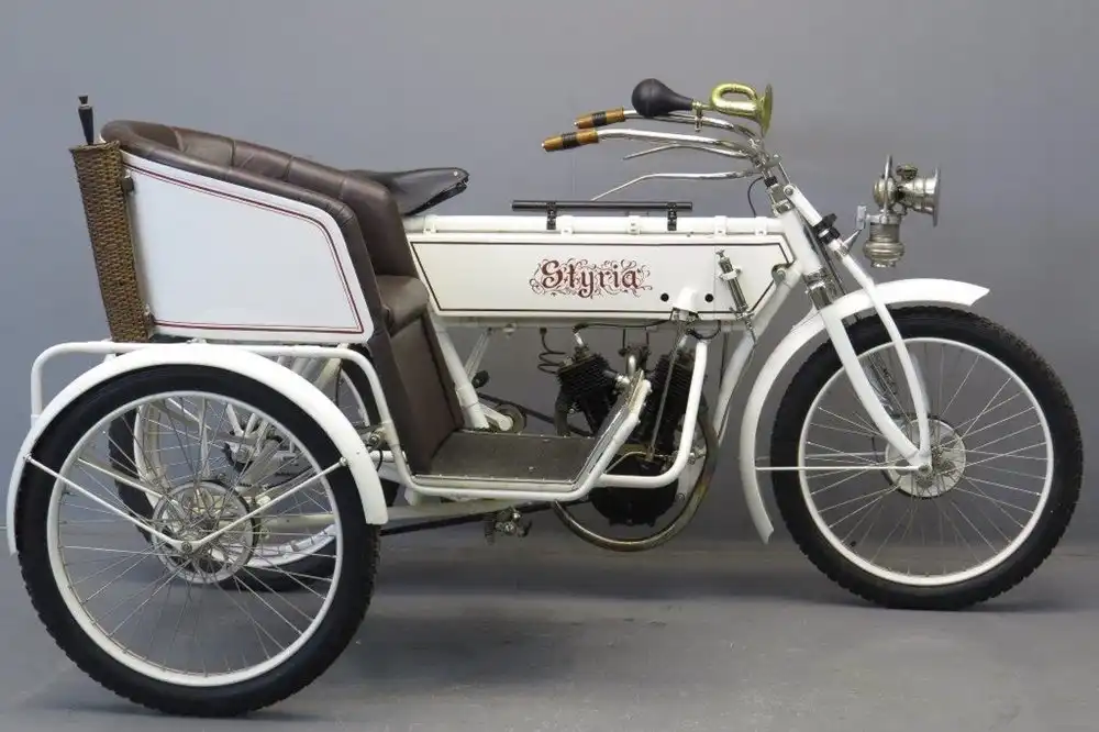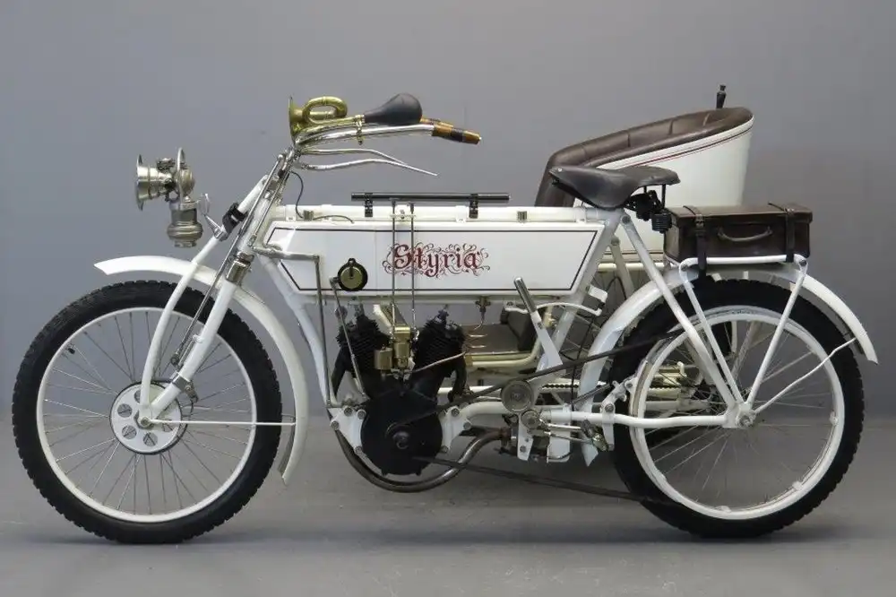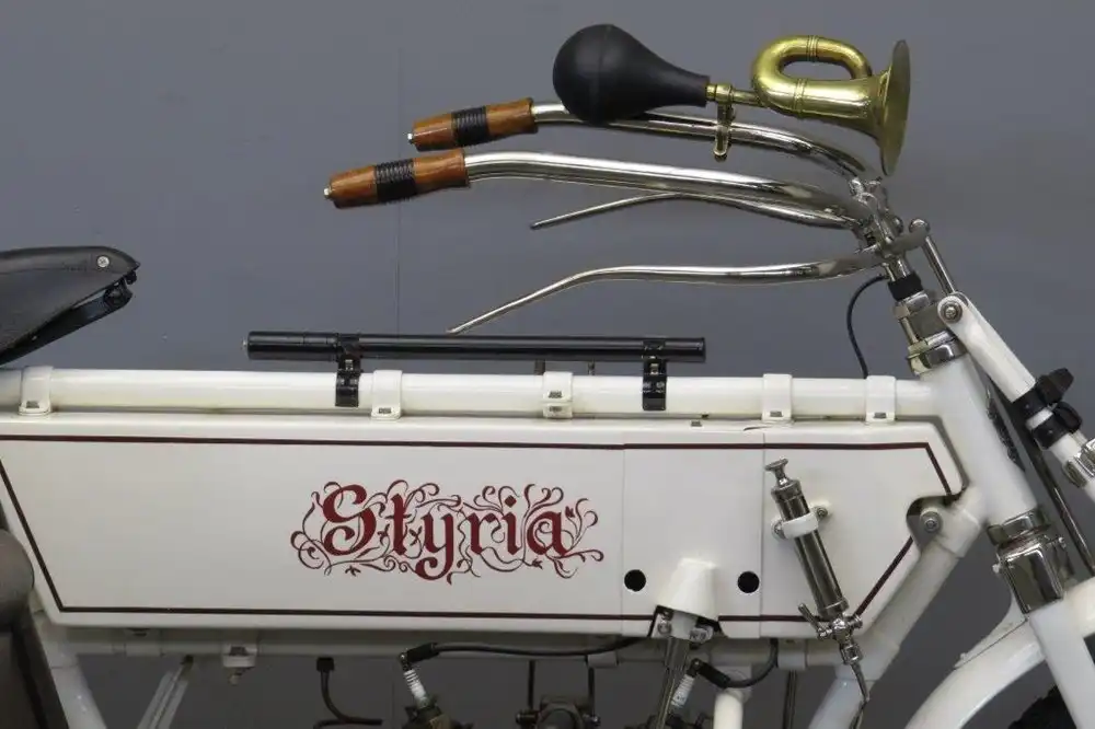 До наших дней дожило мало мотоциклов Styria. На фото представлен самый тяжелый из мотоциклов Styria того периода - Type IIIb. Выпускался мотоцикл с 1906 по 08 год. Машина имеет задний привод, крутящий момент передается от двигателя через кожаный ремень. Она также комплектуется 764-кубовым 2-цилиндровым 5.5-сильным двигателем, магнето Bosch.