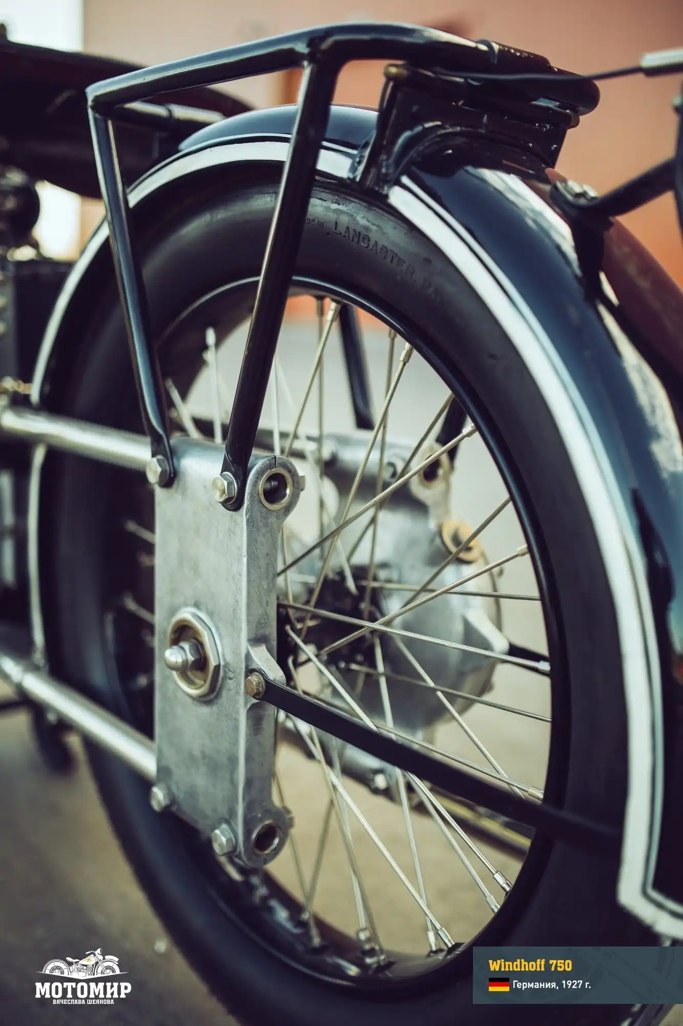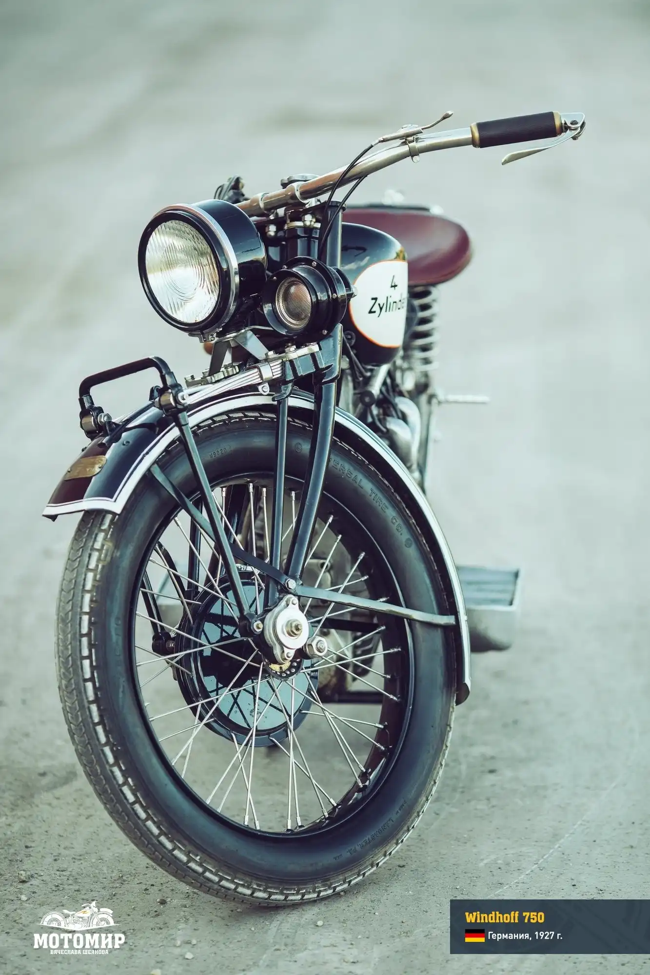 Передняя вилка мотоцикла Windhoff, довольно сложной конструкции, была короткорычажной, а в качестве упругих элементов использовались две короткие четвертьэллиптические рессоры. Ручной барабанный тормоз конструкторы поместили в ступицу переднего колеса. Спидометр располагался на бензобаке, вмещавшем 14 л топлива. Весил четырехцилиндровый «Windhoff» 185 кг и развивал скорость до 120 км/ч. Большого коммерческого успеха эти мотоциклы не имели, но пользовались стабильным спросом у ценителей серьезной техники.