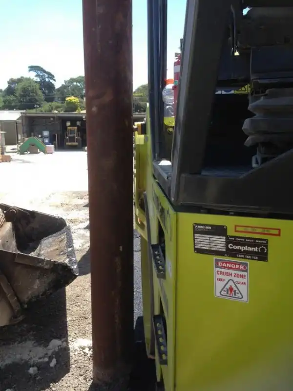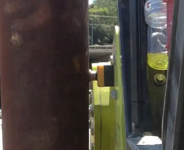 Это специальная кнопка аварийной остановки катка. Оператор так близко проезжал мимо трубы, что труба кнопку нажала и каток автоматически заблокировался. Чтобы каток поехал, надо кнопку отжать. Но чтобы кнопку отжать, надо чтобы каток поехал. Такая вот техническая задачка.