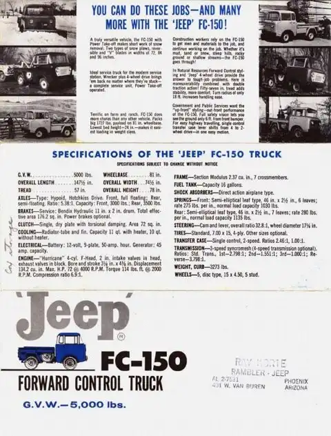 Модель FC-150 вышла в серию в 1956 году, с колесной базой Джипа СиДжей длинной 210 cм, с кузовом 200 cм. Мотор, 2.2 литра, был от выше упомянутого CJ, и развивал мощность в 75 лс. Уже в следующем году, была представлена новая модель FC-170, с намного большей кабиной и новой трансмиссией. Ширина кабины увеличилась со 120 до 140 см. Так же были созданы и запущенны в производство модели FC-170 DRW, FC-180 и FC-190. Выбор двигателей предлагаемый в те годы был от 4 до 8 цилиндров, с объёмом 2.2, 3.7 и 4.5 литров. Так же покупатели могли выбрать двух, или четырех дверную кабину.