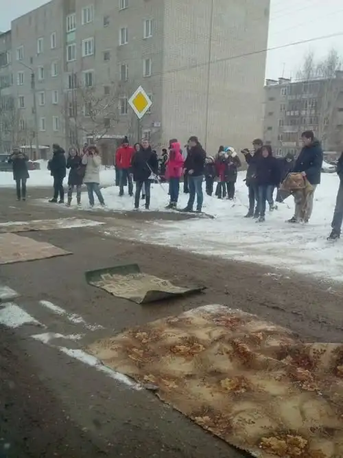 Жители Нововятска Кировской области решили выразить свой протест плохим дорогам при помощи ковров, которыми они застелили ямы на дороге. В этом году вся Кировская область страдает от ужасного состояния дорог, которые после зимнего периода сплошь состоят из ям. Акция протеста не была согласована с властями, однако сотрудники ГИБДД и МВД проследили за ее ходом. На улице Романа Ердякова, ранее носившей название Кирпичная, ямы и вовсе заложили кирпичами.