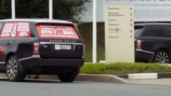 Автосалон, торгующий в Петербурге автомобилями марок Land Rover и Jaguar, нежданно-негаданно оказался сегодня в центре пристального внимания журналистов и просто прохожих. Виной тому послужил кем-то выставленный возле салона автомобиль, обклеенный весьма сердитыми лозунгами.