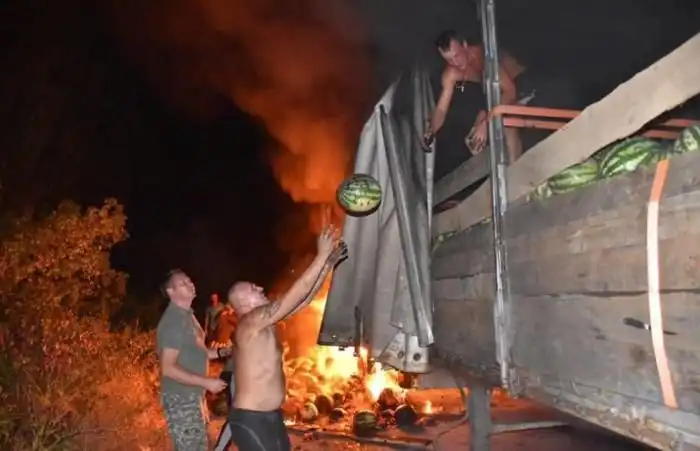 Губернатор Херсонской области Андрей Гордеев вместе с другими участниками дорожного движения принял участие в тушении фуры. Пламя попросту закидали арбузами, которые перевозил грузовик. Соответствующая запись появилась на странице чиновника в Facebook: «После тяжелого рабочего дня, на трассе у села Чернявка, Каховского района, стал свидетелем того, что загорелась фура. Принял решение помочь в тушении пожара, но огнетушители "быстро закончились" и тогда в ход пошли арбузы». Что в это время делали пожарные, остается лишь гадать.