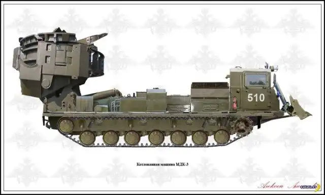 На службе у военных и МЧС есть очень крутая и интересная машина – МДК-3. Служит она для того, чтобы быстро и красиво копать котлованы, ямы в земле, где могут укрыться военная техника и живая сила. Копает при помощи поперечного роторного траншейного экскаватора, установленного на базе тягача МТ-Т. Производительность машины – до 1000 м³ в час (зависит от грунта).