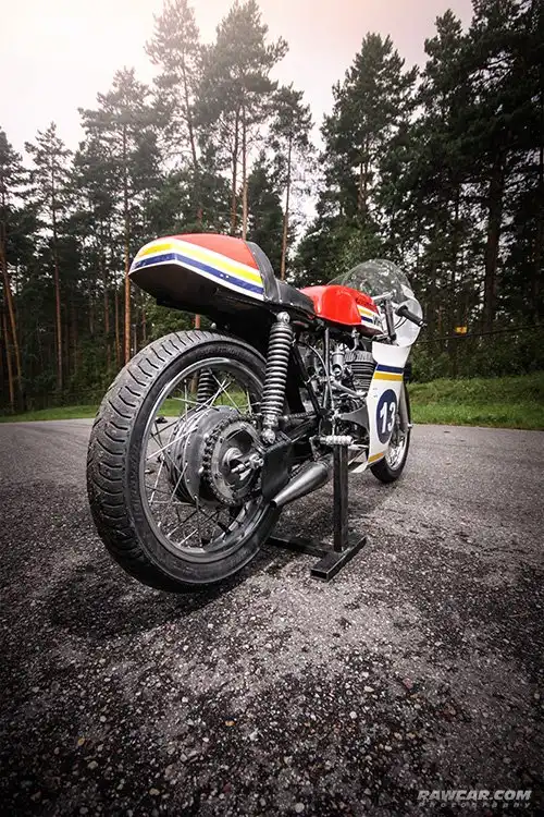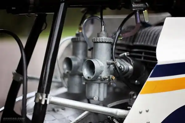 Объём двигателя составлял всего 347 кубических сантиметров, он располагал 2 цилиндрами и работал по 2-тактной схеме, но при этом был способен развивать 65 лошадиных сил. Интересен и необычный карбюратор марки Jikov в системе питания. Коробка передач - 4 ступенчатая, но этого хватало для коротких и затычных треков тех времён.