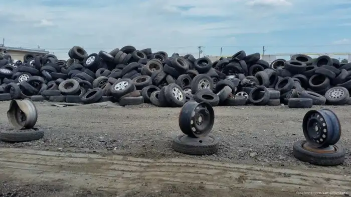 Огромная гора колес. Там и нормальная резина, и лысая и диски. Все в одной куче копаться в которой совершенно не хочется.