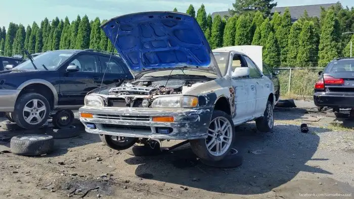 Кто-то подготовил Субарик под покраску и не покрасил. Родные 17-е диски судя по всему никому не нужны. На ebay за такой комплект просят от 600 долларов. Здесь он обойдется вам в $55 за штуку (20 диск + 35 резина).