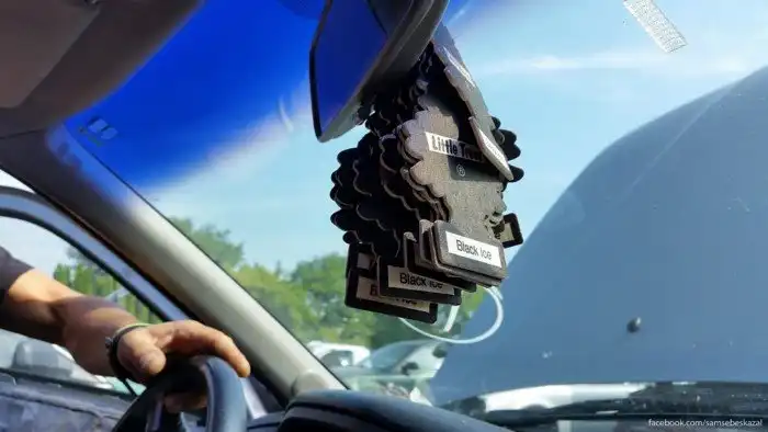 Удивило большое количество елочек в машинах. В некоторых прямо гроздьями висят.