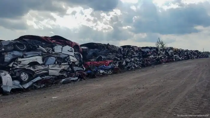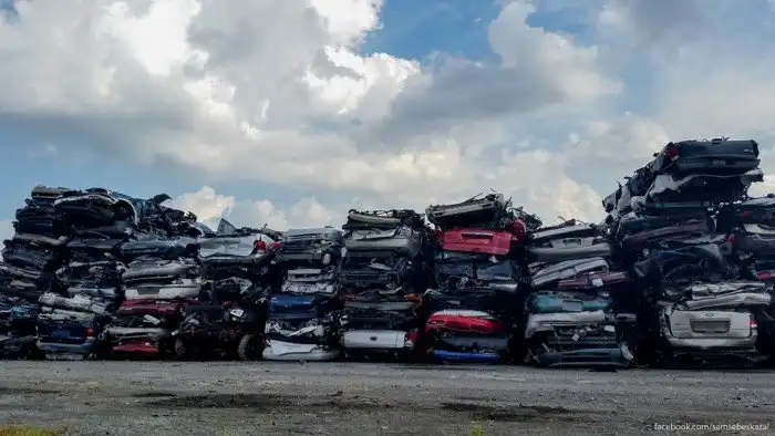 Машины прессуют и ставят штабелями. Обратите внимание, что прессуют их частенько прямо с колесами.