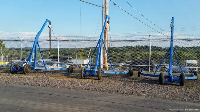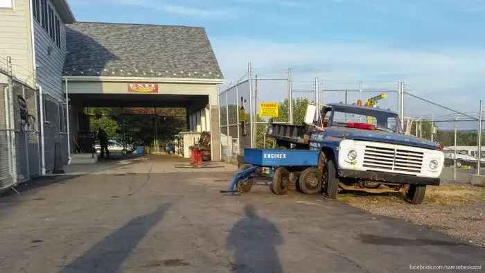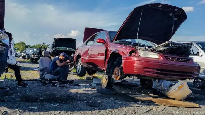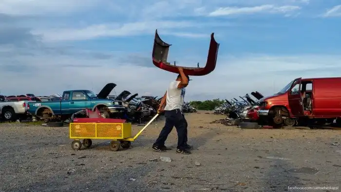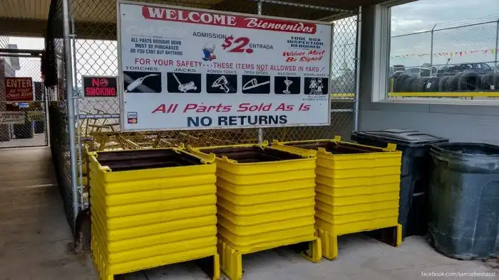 На входе вы можете арендовать тележку для запчастей или кран для демонтажа двигателя. Тележка стоила 2 доллара. Кран не знаю сколько, но уверен, что недорого. За все оборудование надо еще заплатить залог (за тележку просят $20). Тем самым они исключают ситуации, когда вы тележку взяли, но нужной запчасти не нашли и бросили ее в другом конце разборки.