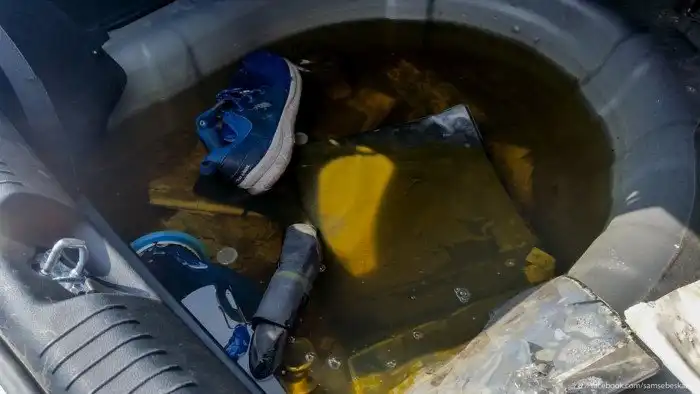 У многих открыты багажники и двери. Внутрь попадает вода, которая приводит в негодность сиденья и салоны. Но здесь это никого не волнует.