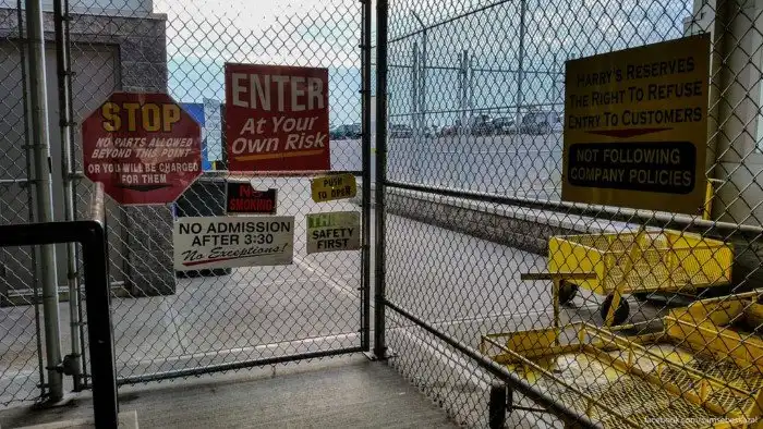 Правила предельно просты. На территории нельзя использовать газовые резаки, электроинстурумент и домкраты. Соответственно, все это нельзя проносить внутрь. На входе у всех обязательно проверяют ящики и сумки. Нельзя входить в открытой обуви (это тоже проверяют). Нельзя проносить алкоголь и приводить с собой детей. В правилах на стене этого нет, но с рюкзаками и фотоаппаратами тоже не пускают. Так как авторазборка это частная собственность, то отказать в посещении могут без объяснения причин. Вход на территорию стоит 2 доллара. Вам на руку ставят печать, как в ночном клубе, и потом можно свободно входить-выходить в течении дня.
