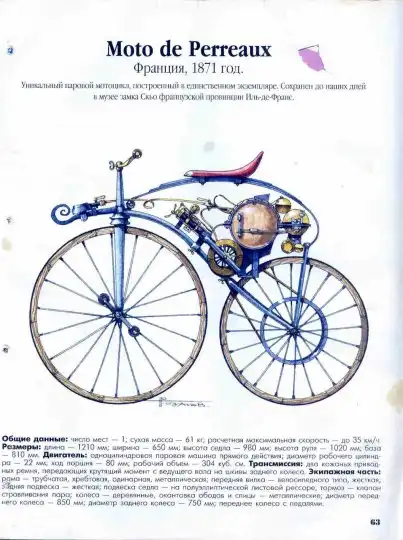 Итак: можно его представить как велосипед с паровым двигателем, построенный талантливым французским инженером-механиком Луи Гийомом Перро. Родился он в 1816 году в городке Альменехес. Он не сразу подошел к разработке такого транспортного средства. Многим пришлось ему заниматься в жизни. В числе прочих его изобретений различные виды оружия и подводная лодка с пневматическим двигателем.