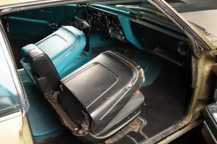 Водительская сторона автомобиля была полностью восстановлена до безупречного музейного состояния. Эту половинку машины окрасили красивейшим бирюзовым металликом Tahoe Turquoise, полностью обновили весь декоративный хром на бамперах и облицовке, перешили салон, используя аутентичные материалы, аналогичные заводским.