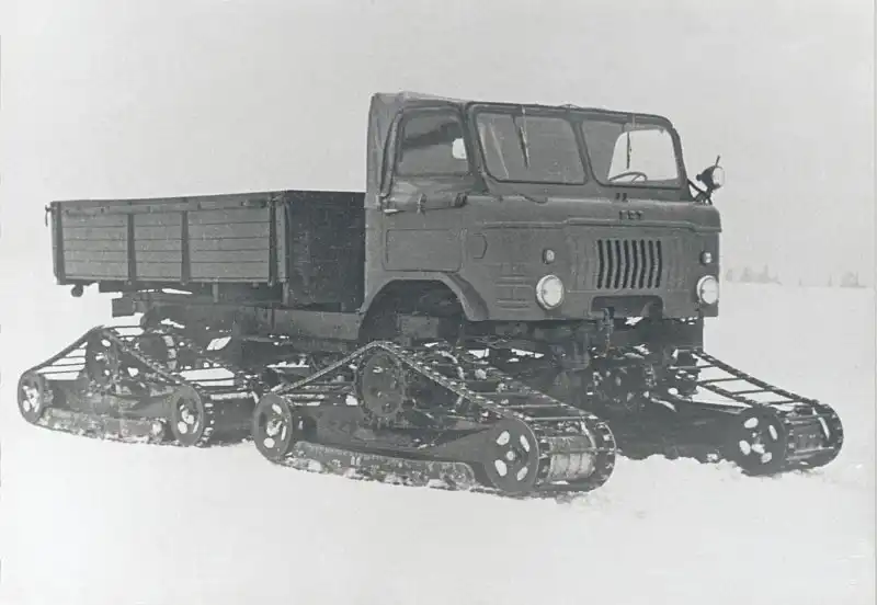 Один из двух экспериментальных гусеничных вездеходов-«конверсий» ГАЗ-66 с движителем С.С. Неждановского во время испытаний в феврале-марте 1961 года на базе в Березниках, на северном Урале.