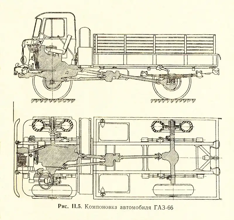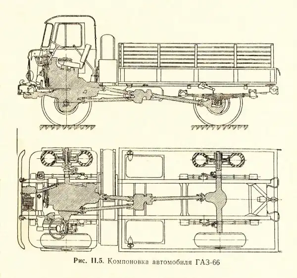 Компоновка ГАЗ-66 (показана модификация 66А с лебедкой).