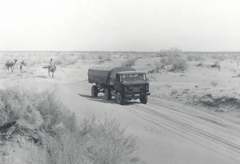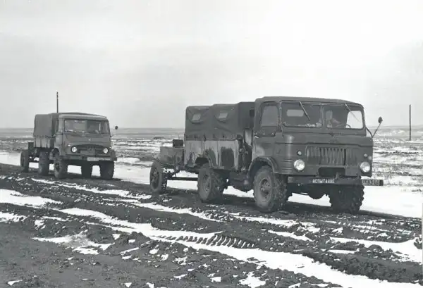 Автопоезд в составе седельного тягача ГАЗ-66 и активного полуприцепа 1-ПП-4 грузоподъемностью 4 т проходит проверку Каракумами, 1961 год. Подобные «сцепки» создавались, например, под перевозку ракетных выстрелов. В производство автопоезд не поступил.