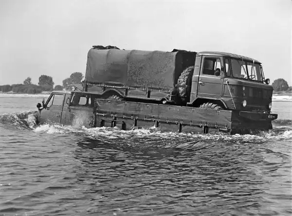 Экспериментальный четырехосный плавающий автомобиль ГАЗ-44 преодолевает водную преграду с ГАЗ-66 в кузове. У «шишиги» открыты форточки лобового стекла. 1972 год.