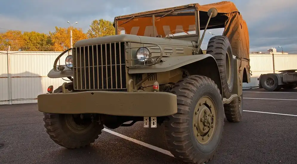Военным шоферам Додж запомнился в том числе своей отличной устойчивостью. Перевернуть его, в отличие от узкого Виллиса, очень тяжело, почти невозможно. И это неудивительно: Dodge широк, а центр тяжести расположен достаточно низко. Под широченными крыльями стоят широкопрофильные колёса с разъёмными дисками, что сильно упрощало замену резины в случае необходимости. Вместо водительской двери стоит запасное колесо, поэтому сесть на место водителя можно лишь через пассажирское. Неудобно, конечно, но зато эта «запаска» не занимала полезное пространство внутри внедорожника и хотя бы немного защищала водителя от случайных осколков. Каждый раз лазить через пассажира было неудобно, поэтому многие эту запаску снимали, открывая более привычный доступ к месту водителя. Я бы даже сказал, очень лёгкий доступ: дверей у машины нет совсем. Есть, правда, ремень, который накидывался через тот проём, где у большинства других автомобилей стоит пассажирская дверца. Подножка, на которой установлено запасное колесо, имеет небольшой изгиб. Вполне можно было бы обойтись и без него, тем более что с пассажирской стороны она абсолютно прямая, но эстетика есть эстетика. Без неё себе американцы войны не представляют.