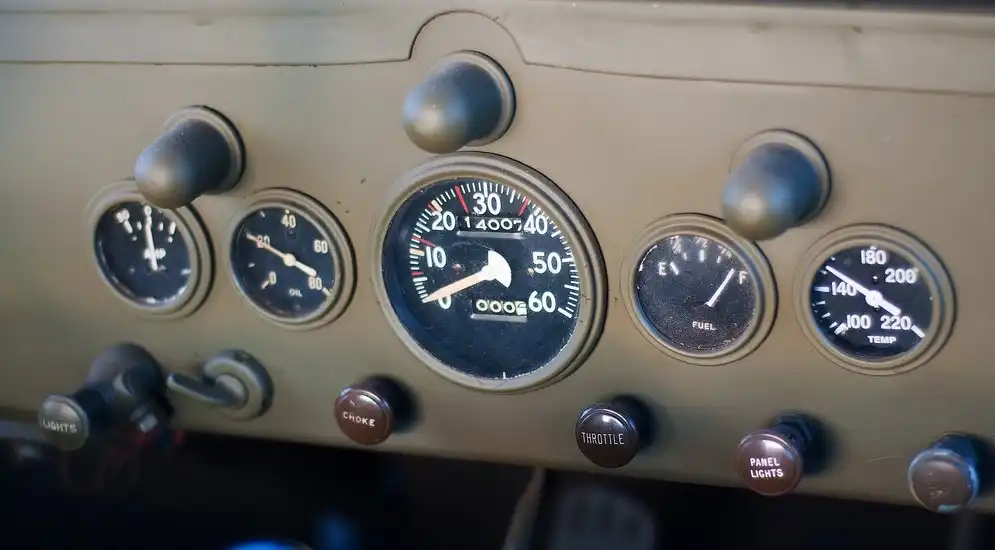 Приборы тоже имеют англоязычные подписи, но в общем всё понятно: амперметр, манометр, измеряющий давление масла, спидометр с одометром, указатель уровня топлива и указатель температуры воды в системе охлаждения. Спидометр, ясное дело, размечен в милях, а шкала термометра – в градусах Фаренгейта. Приборы читаются хорошо, но только если смотреть именно на них: они стоят по центру и очень низко, поэтому на ходу следить за их показаниями неудобно. Да и некогда.