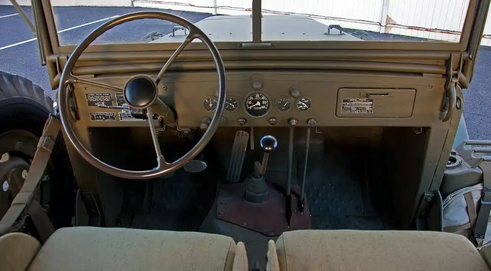 Назначение рукояток тоже можно понять интуитивно или после небольшого исследования. Это центральный переключатель света (с защитой от непреднамеренного включения – американцы, что скажешь), флажок включения зажигания, «подсос», кнопка фиксированного газа, выключатель подсветки приборов и кнопка включения фары-искателя (которой у нас, напоминаю, нет). Под рулём ещё есть переключатель указателей поворотов, но в 1942 году этого рычажка, конечно, не было. Что ввело меня в ступор – так это наличие рычага привода вентиляционного лючка для забора внешнего воздуха. Зачем он на открытой машине, где даже нет дверей? Для меня это оказалось великой загадкой. Тем более что само лобовое стекло можно открыть аж двумя способами: подняв его вверх на 90 градусов или полностью положив на капот рамку «лобовухи». Если кто-то скажет, зачем нужна ещё и эта вентиляция, я буду очень благодарен. Скорее всего, эта «опция» досталась от цельнометаллического кузова, например, санитарного WC-54.