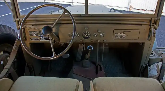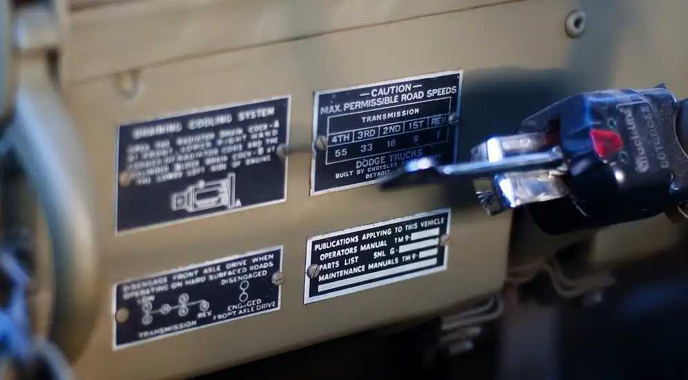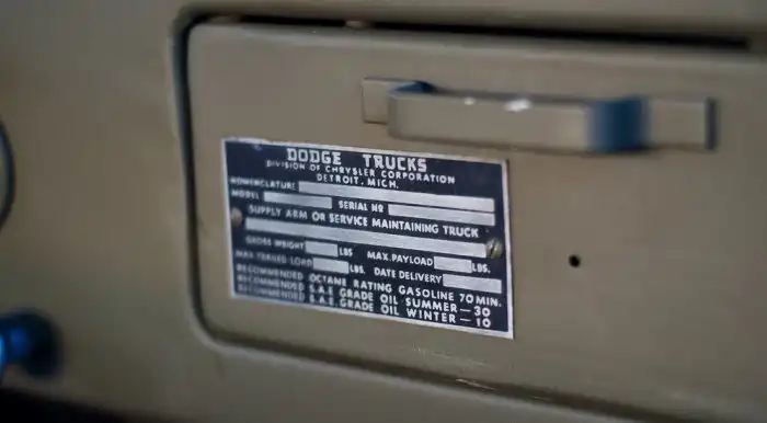 Рассмотрим приборную панель. Тут всё традиционно по-американски удобно, а главное – информативно. Таблички на панели расскажут о схеме переключения передач, скорости, при которой их надо переключать, о том, как слить воду из системы охлаждения, и даже о том, по какому каталогу заказать запчасти и расходные материалы для ремонта и технического обслуживания внедорожника. Правда, на английском языке, поэтому их ценность (кроме, разве что, схемы переключения) в советской армии стремилась к нулю. Табличка над «бардачком» сообщает, когда машина была ввезена в СССР. Конечно, всё это при постоянном упоминании, что этот замечательный truck – именно Dodge. Кстати, табличка на генераторе гласит, что его сделала компания Auto-lite. Реклама на Доджах имеет больший смысл, чем на Студебеккерах, потому что их доля на рынках других стран (помимо СССР) была гораздо существеннее.