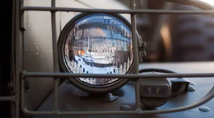 Что же, пора по традиции обойти машину по кругу. Начнём с передка. Фары автомобиля закрыты защитными решётками, причём слева и справа они отличаются: на стороне водителя за решёткой должна стоять ещё и фара-искатель, которой на нашем автомобиле нет. Зато у нас стоят указатели поворотов, которых тут быть не должно. На этом различия между армейскими Доджами сороковых и нашим экземпляром заканчиваются, все остальные детали оригинальные. Американцы, как и матушка-природа, не терпят абсолютно прямых линий, поэтому бампер имеет небольшой изгиб, в верхней части которого видно отверстие для заводной ручки. Как ни странно, провернуть и запустить шестицилиндровый мотор «кривым стартером» совсем не сложно: заводится с пол-оборота.