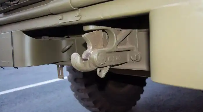 На заднем борту крепятся некоторые инструменты: топор, лопата и кирка. Последняя – в разобранном состоянии, отдельно от черенка. Так как это больше относится к комплектации автомобиля, а не к его конструкции и ездовым характеристикам, тест-драйв инструментов проводить не будем, а посмотрим чуть ниже борта. Фаркоп Доджа удобен в использовании: крюк защёлкивается сам, а чтобы его открыть, достаточно нажать на рычаг снизу. Немного больше хлопот доставляли отбойники, которые при буксировке пушки надо было снимать: они сокращали угол поворота.