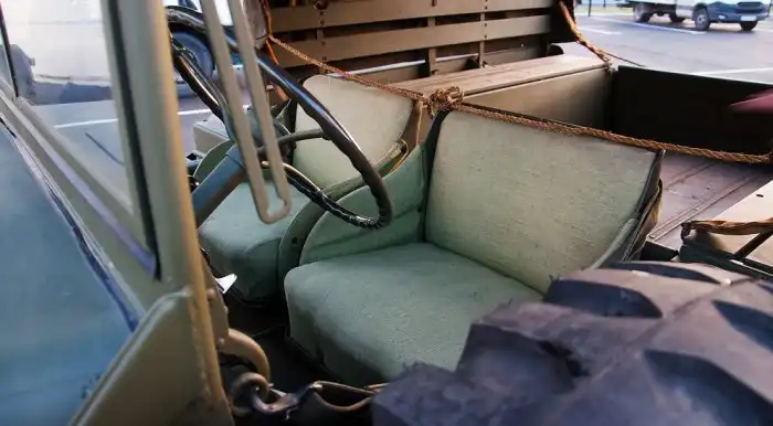 Мотор работает ровно и гораздо тише, чем можно ожидать от семидесятилетнего военного внедорожника. Рядом с «ручником» торчит рычаг включения переднего моста, но мы его включать не будем: поездка состоится по брусчатке и асфальту, а управляемость машины на таком покрытии с полным приводом оставляет желать лучшего. Да и не нужен нам передний мост на асфальте.