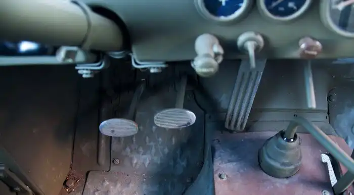 Мотор запускаем электростартером, педаль которого расположена, на мой взгляд, не слишком удачно. Дело в том, что она стоит над педалью газа, которая, в свою очередь, стоит не на полу, а на тоннеле трансмиссии. Получается достаточно высоко и не вполне удобно. Однако закроем на это глаза и заведём машину.