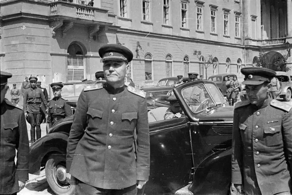 Маршал Советского Союза Иван Конев. В его кортеже замечен автомобиль «Додж» 3/4 с кузовом ЗИС (справа на заднем плане). Снимок сделан во время посещения освобождённого Львова командующим 1-го Украинского фронта, август 1944 года