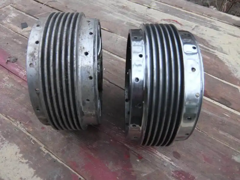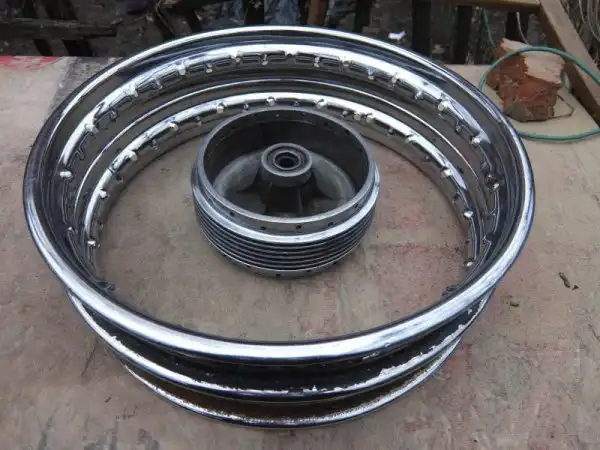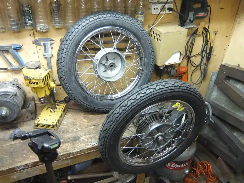 Так же необходимо было отполировать барабаны колёс, поменять в них подшипники, заменить накладки и собрать колёса обратно. С накладками отдельная история, я думаю всем понятно что шляпка заклёпки должна быть утоплена в накладку чтобы не тереть барабан, так как я клепал обратными заклёпками, утопить их было не так просто, для этого был изобретён хитрый способ, между заклёпкой и пистолетом прокладывалась гаечка, в итоге получался хороший результат. Тренировался спицевать я на старых спицах и на старом ободе, после двух попыток, я перешел к спецовке основных колёс, первое мне тяжело давалось, видать обод был немножко кривоват, но всё же я его довёл до нужной кондиции, с вторым было по проще, на всё я потратил часа 3 — 3.5.