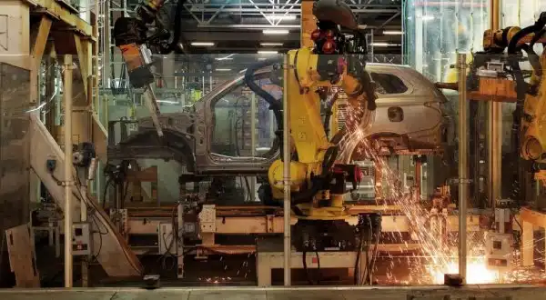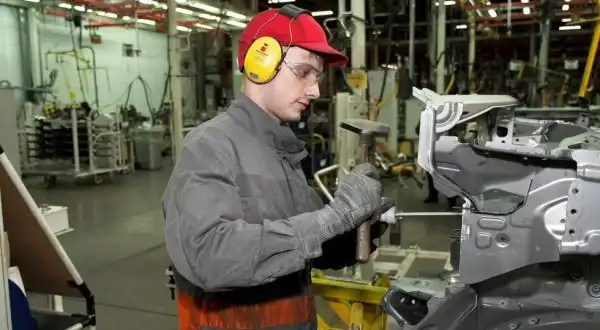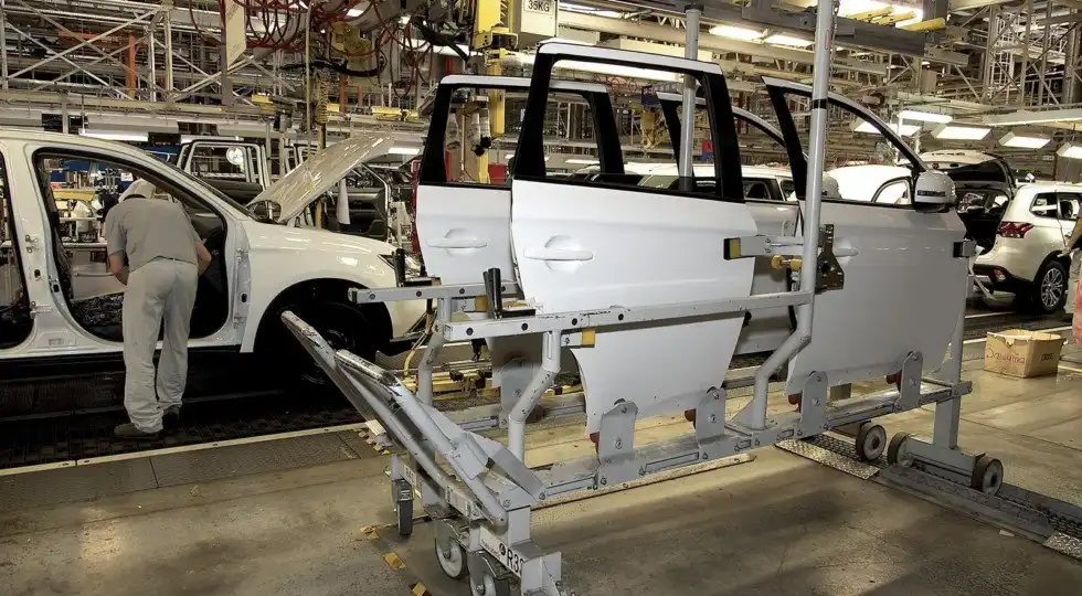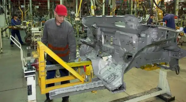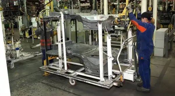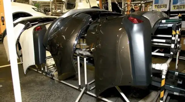 Так, сборка кузовов начинается с того, что рабочие на кондукторах при помощи ручных приспособлений для точечной сварки соединяют относительно мелкие детали в более крупные блоки. Иногда им и вовсе приходится брать в руки молоток, чтобы подогнать детальки «по месту». Но вот окончательную сварку осуществляет огромный, полностью роботизированный комплекс. Вышедшее из него неокрашенное изделие уже походит на автомобиль, и на этом этапе осуществляется первая проверка качества: кузов поступает в «световой бокс», где специальные лампы делают ясно видимыми все дефекты штамповки и сварки. Затем на кузов навешиваются двери, и он на 9 часов отправляется в окрасочный цех.