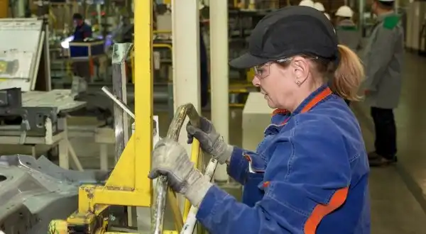 Обращает на себя внимание то, что на сборке работает очень много женщин. И вновь мы постоянно сталкиваемся с сочетанием ручных и роботизированных операций. Например, клей на лобовое и заднее стекла наносит робот (интересно, что при нанесении двигается само стекло, а сопло, из которого поступает клей, остается неподвижным). Затем стекло при помощи специальных присосок перемещают к автомобилю, а окончательная вклейка осуществляется вручную. Или взять, например, внутризаводскую логистику. На заводе «ПСМА Рус» можно увидеть и электрокары, которые везут целые поезда из тележек-контейнеров с комплектующими, и отдельных рабочих, которые просто деловито катят одиночный стеллаж на колесиках с закрепленным на нем комплектом дверей.