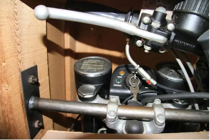 Руль снят — вместо него стоит кронштейн для фиксации мотоцикла в коробке