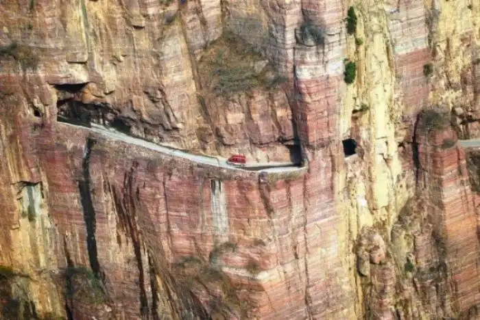 Захватывающе, не правда ли? Открытая в 1977 году дорога из китайской деревни Голиань, думается нам, по впечатлениям уступит разве что «Дороге смерти» в Боливии. Всего 1200 метров и туннель, в котором не разминутся и две легковушки. Плюс во-о-о-т такой глубины пропасть.