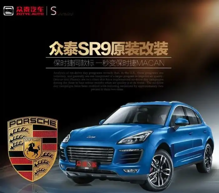 Китайский кроссовер Zotye SR9 является практически точной копией немецкого премиального кроссовера Porsche Macan. Дизайн автомобилей идентичен, однако техническая начинка и стоимость сильно отличаются. Бюджетный Zotye в КНР стоит 15 000 долларов, в то время как за люксовый Porsche придется выложить 144 000 долларов. Для тех, кто хочет, чтобы их автомобиль стал еще более похожим на «Порше» подготовили комплект эмблем, шильдиков и прочих аксессуаров, который обойдется в 29 долларов. А теперь взгляните, как выглядит никому неизвестный Zotye с символикой Porsche.